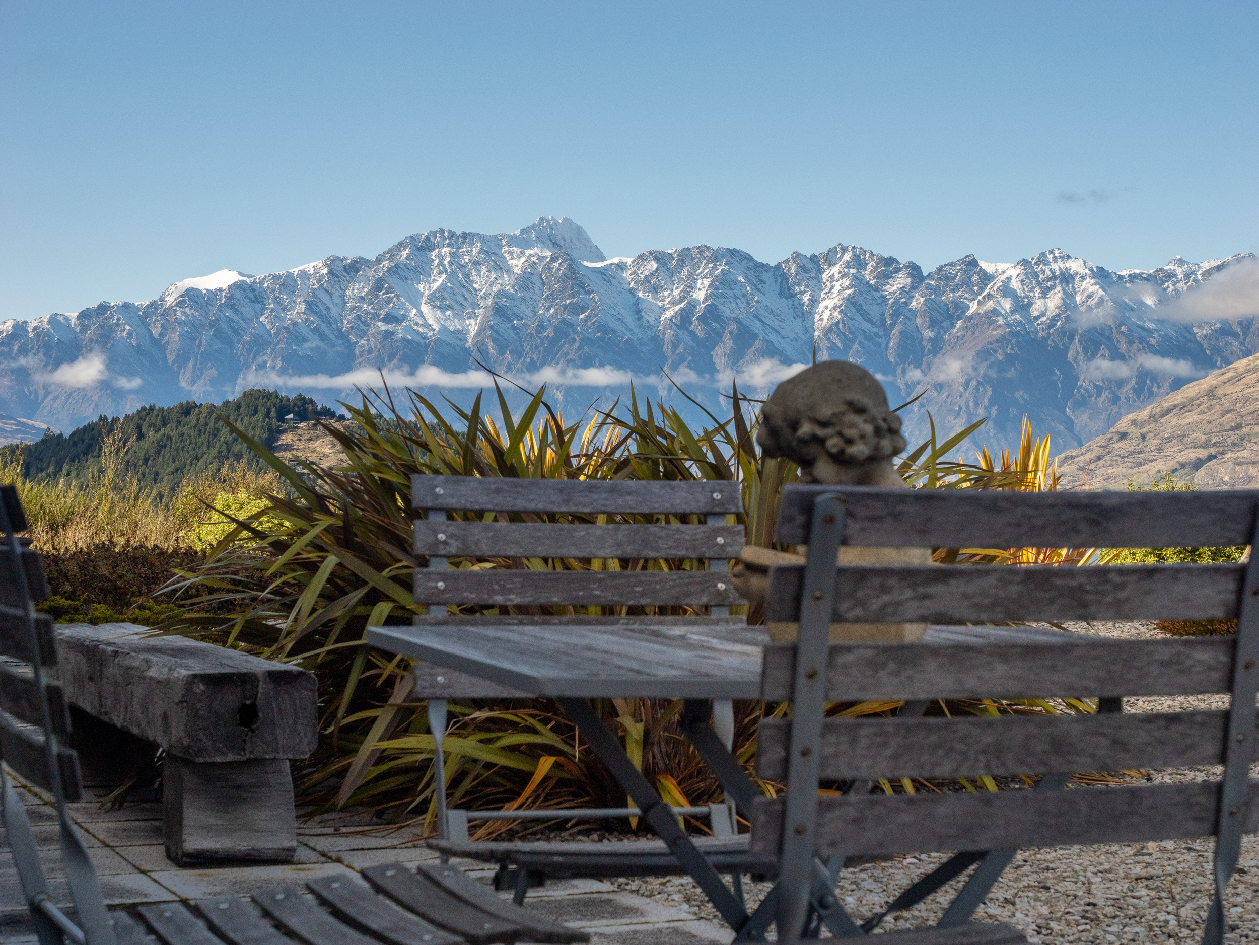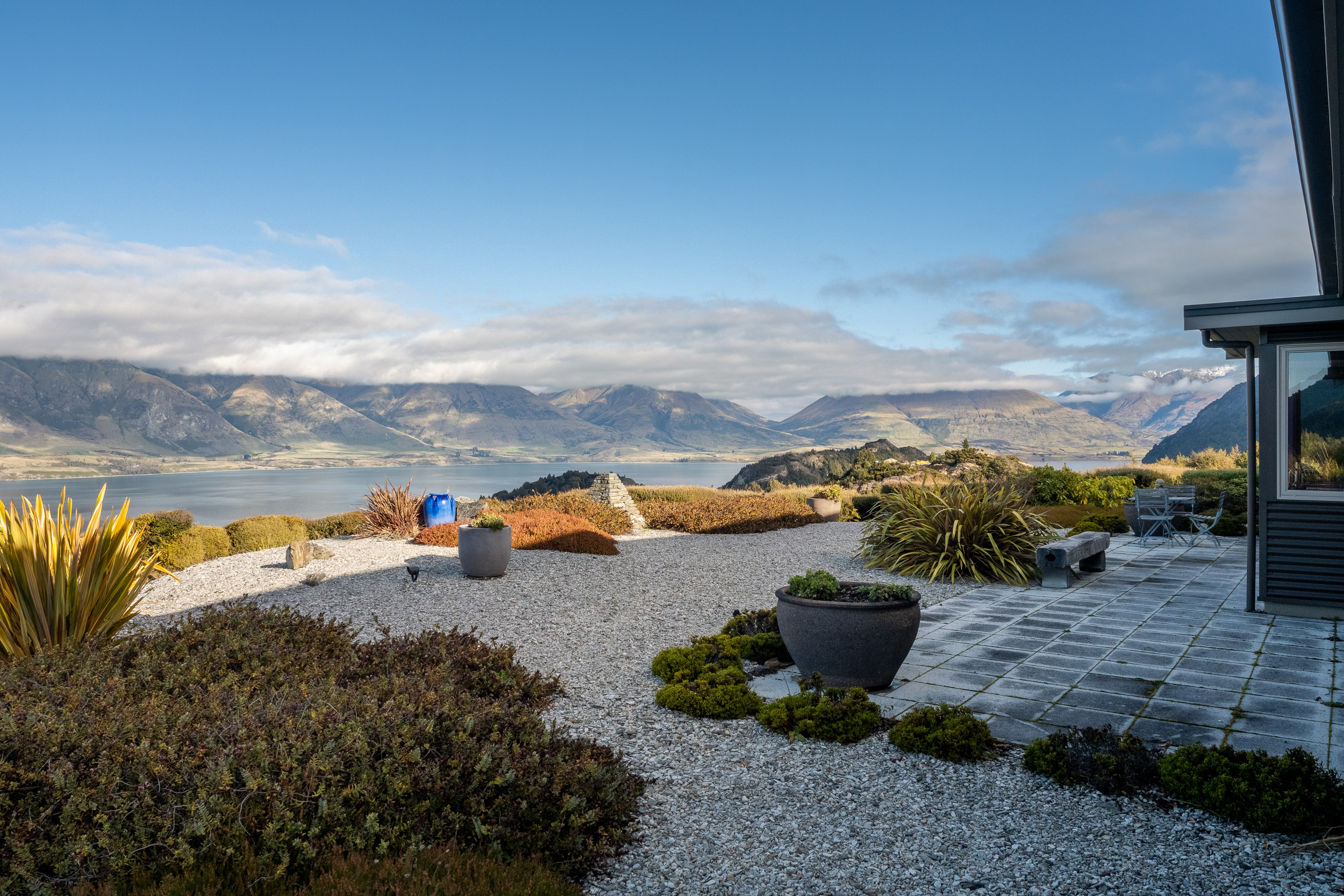 Carefully chosen mature planting covers much of the 3,547m2 site, showing colour and form all year. Native tuis and bellbirds thrive amongst the well-established NZ natives and other plants suited to an alpine climate. Three paved courtyards around the house are planted with decorative trees, heritage roses, herbs and lavender. The main courtyard has a delightful fountain-fed water feature. Each courtyard has a different orientation for views and wind protection.