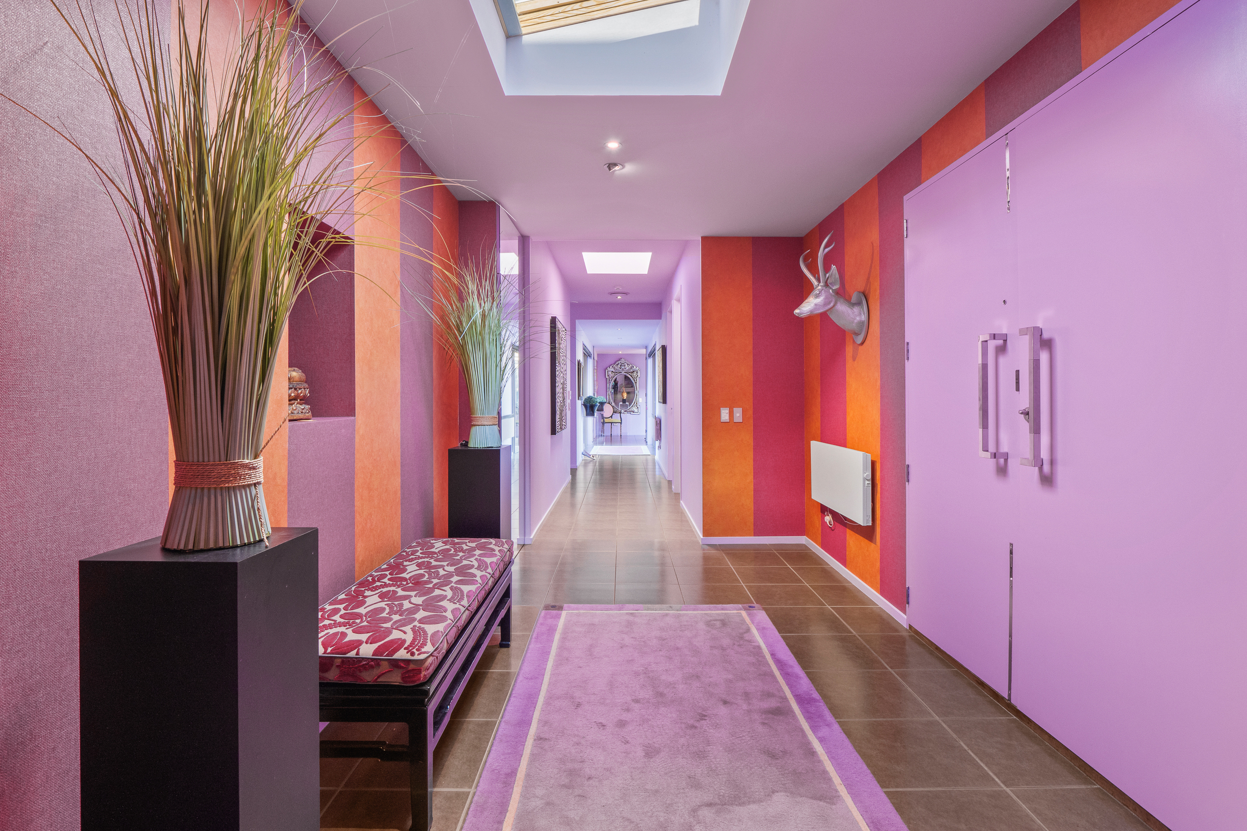 The living and dining rooms, conservatory, and kitchen feature bespoke joinery, integrated sound and TV systems, and plenty of storage. The double front door, painted in alpine orange, opens to reveal an entrance gallery with in-built cupboard space and a spot-lit niche for art display.