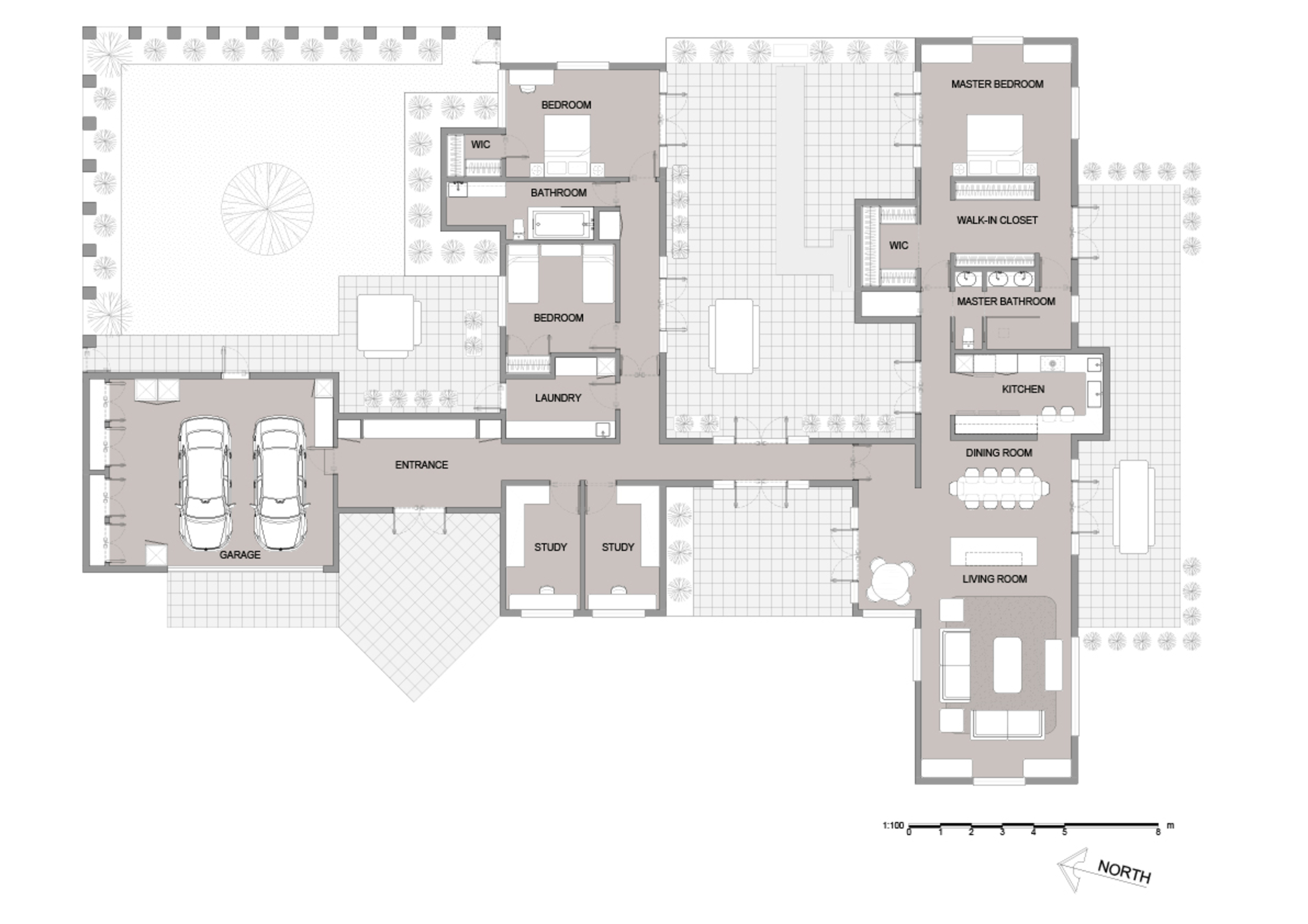 The home has three bedrooms plus two side-by-side studies. The latter could easily be converted to a fourth bedroom or media room. The master suite has a separate dressing room and ensuite bathroom. The other two spacious bedrooms are in a separate wing. They share an adjacent bathroom and a kitchenette. The double garage is carpeted, with custom made cupboards lining two walls and an additional fridge and separate freezer.